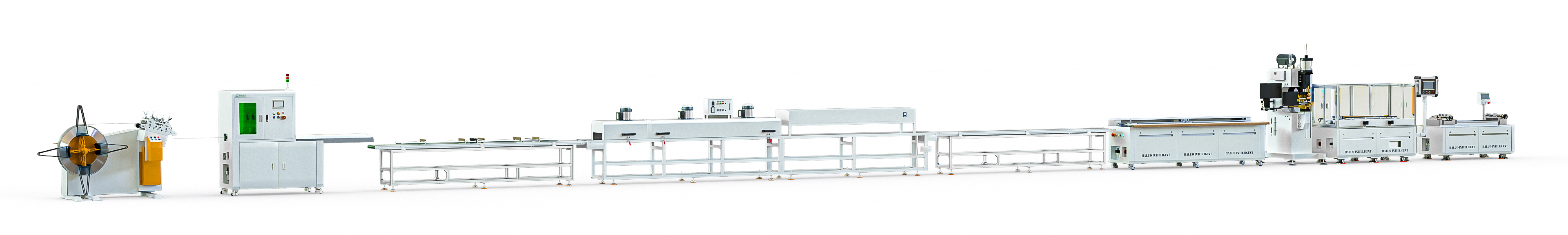 原料开卷整平冲切落料、自动穿套管、热收缩与冷却、环切修平、自动折弯、焊接、尺寸检测、绝缘耐压、拉拨力检测。