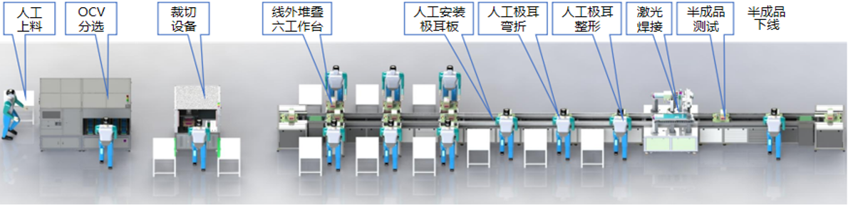 Pouch battery pack production line,including cell feeding,cell sortingand assembly,electrode ear processing and welding, cell assembly and fixation,module packaging and sealing,BMS installation and debugging,performance testing and aging testing,finished product packaging and offline automation production processes.